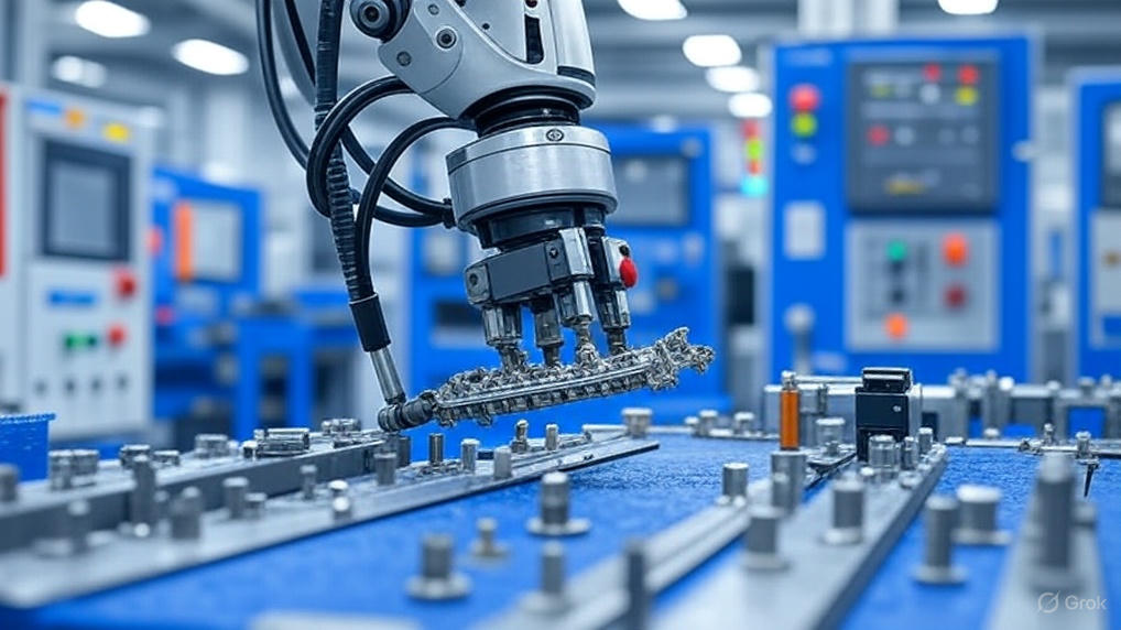 高精度智能制造产线,机械臂正在进行微米级精密零组件的自动化组装与检测,代表消费电子核心部件的极致工艺与品质保障。